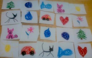 Ilmeisesti tuon Jaffapelin innoittamana Miina tahtoi pelata jotain muutakin. Tyttö keksi haluta pelata muistipeliä. Meillä ei valitettavasti sellaista ole, täytyisi ehkä ostaa. Muita pelejä kylläkin. Minä sitten ehdotin, että Miina piirtämisestä pitävänä tyttönä tekisi omat paperista. Hän innostuikin ideasta, eikä antanut edes leikkaamisessa auttaa itseään. Ainut mihin puutuin oli se, että paloja tulee parillinen määrä. En edes leikkaamisviivoja hänelle piirtänyt. No, jälkikin on sen näköistä, mutta kyllä tällä muutamia pelejä pelattiin ihan hyvin.